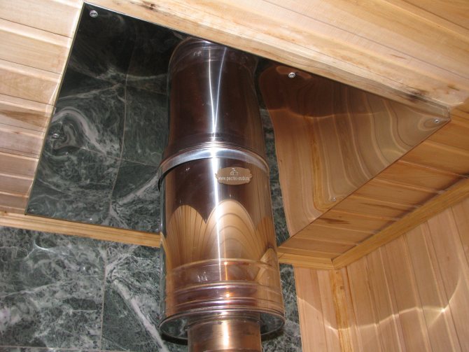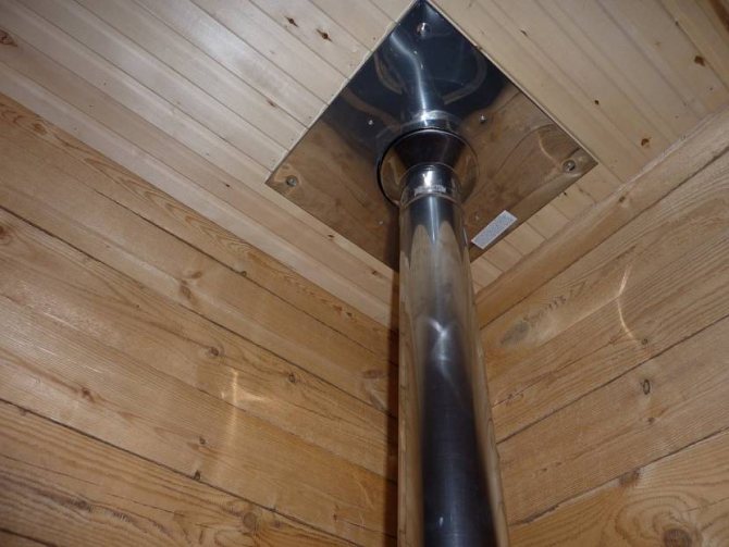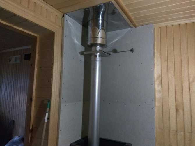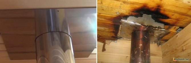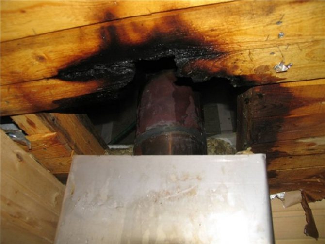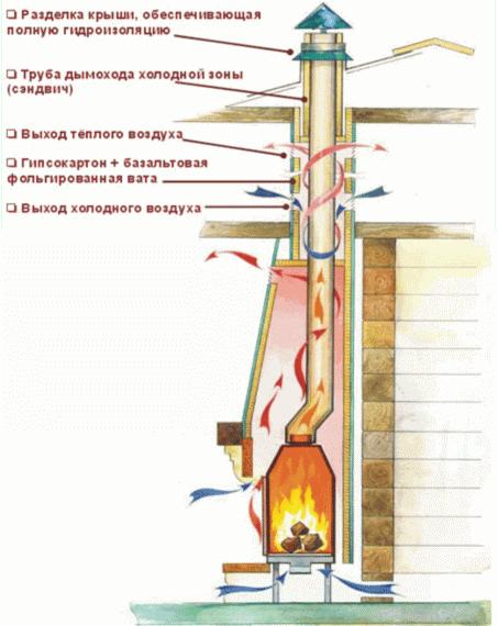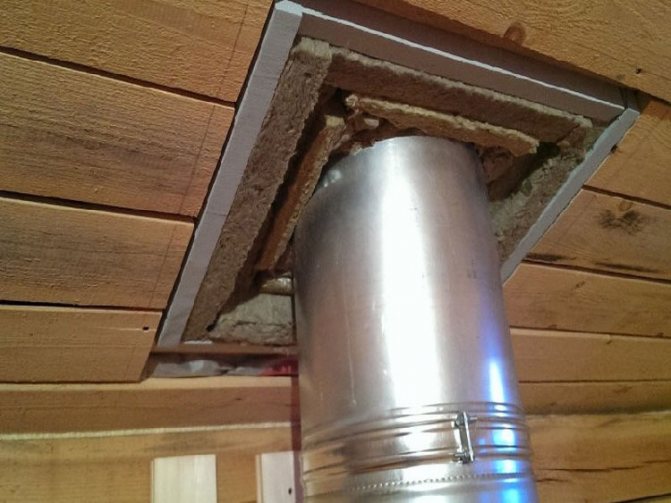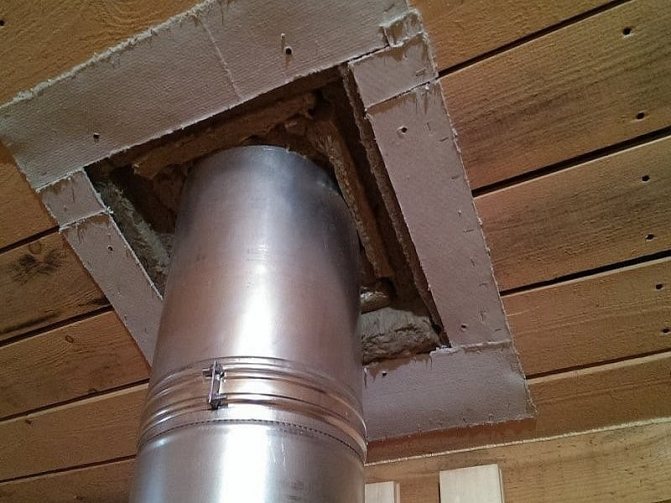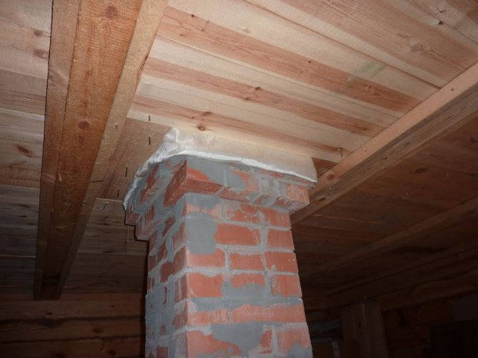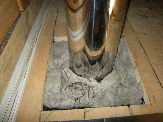 За тази цел се изгражда дървена кутия между тръбата и покрива от елементите на гредите. Коминът трябва да бъде разположен вътре в канала на разстояние най-малко 15 см от стените му.Пространството между комина и стените на канала е запълнено с негорим материал с ниска топлопроводимост (обикновено минерална вата).