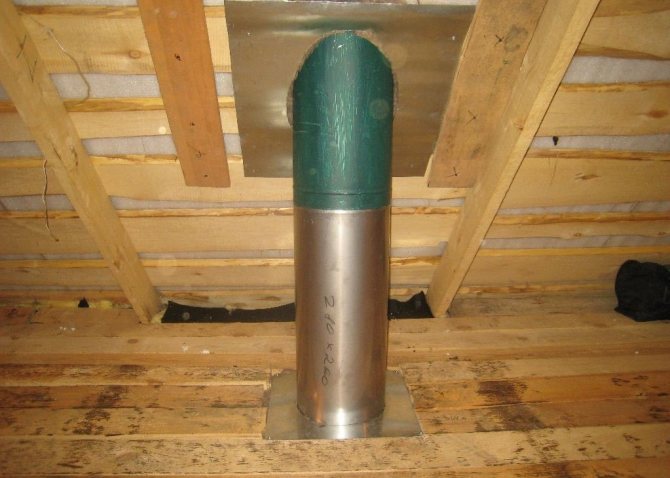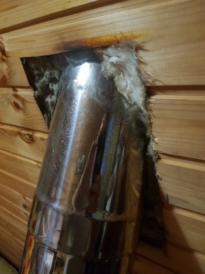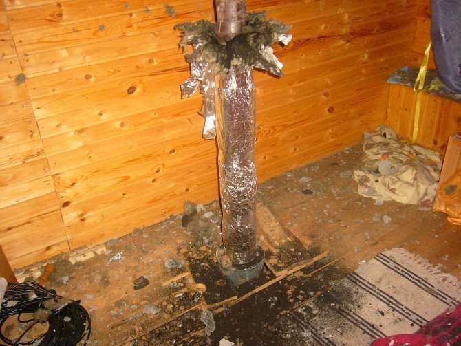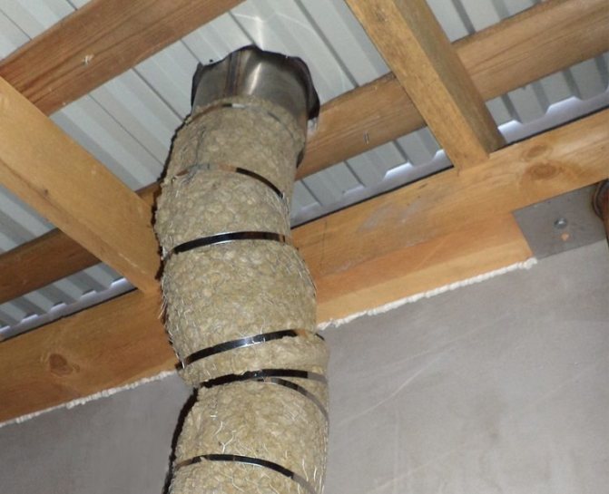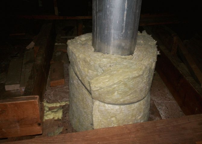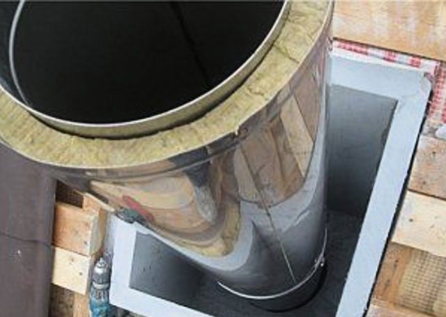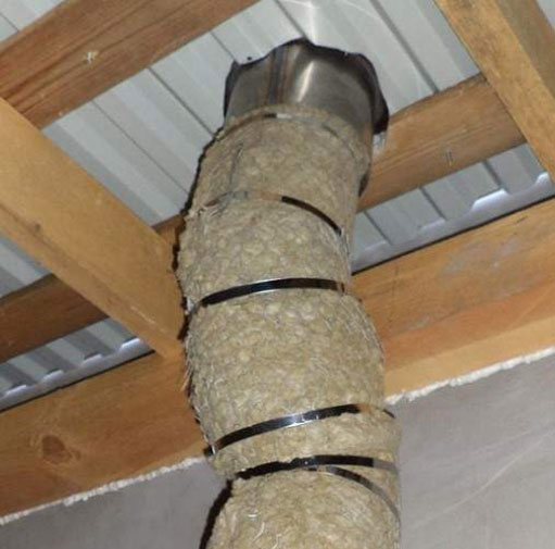Отворът трябва да е с около 0,5 mm по-дебел от диаметъра на канала. Това ще осигури лесно поставяне. Топлоизолацията е опакована по външната и вътрешната стена. Разстоянието между тях е 1-2 см.