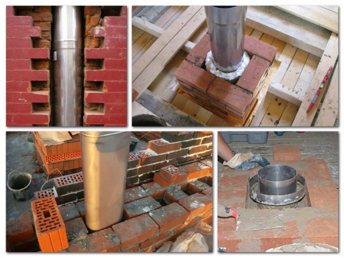 При изграждането на конструкции е необходимо те да бъдат разположени по специален начин на местата, където преминават подовете. Идеалният вариант би бил да отрежете комина на тавана. Височината на този участък от зидария трябва да бъде най-малко три реда тухли. Дебелината на стените на комина при преминаване през покрива или стената (преградата) трябва да бъде по-голяма от основната височина. Разстоянието до горими материали трябва да бъде най-малко 25 cm.