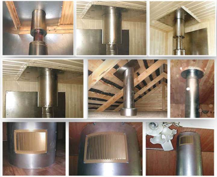 Ако нямате готов комплект, можете да извършите висококачествено отопление на печката в къщата без него. За това свободното пространство в тавана е запечатано с огнеупорна топлоизолация, върху която са монтирани стоманени ленти. Върху него е монтирана плоча от топлоустойчиви метали, в която е изрязан подходящ отвор. Такава плоча е закрепена с болтова връзка. Най-удобно е да го направите от метал.