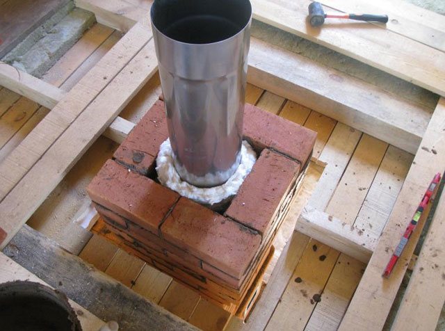 Дупката в тавана е фиксирана с лист от неръждаема стомана или плоча от минитерит. В центъра на листа се изрязва прозорец, през който ще мине коминът. Дължината и ширината на този отвор трябва да надвишават сходните параметри на тръбата буквално с 3 ÷ 5 mm. При полагане на комина, на около три до четири реда до тавана, върху него се поставя лист с подготвен отвор и след това полагането се извършва по-нататък до височината на чистия под на тавана. Дървените подове се полагат с минерална вата, за да се намали преносът на топлина от тръбата. Но по-надежден начин ще бъде кутия от неръждаема стомана, в която ще премине тухлен комин, разстоянието от тръбата до стените също е положено с минерална или каолинова вата с 5-7 cm.