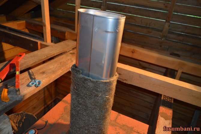 - почистваме остатъците от разтвора, мръсотията, боята от повърхностите; сглобяваме готовото стоманено защитно устройство (корпус), което се състои от няколко части и се поставя върху тръбопровода като обикновена скоба от 2 части; поставете на първата част и запълнете вътрешното пространство със слой топлоизолация; Пример за топлоизолация, монтирайте следните секции на комина, работата се извършва по подобна схема; на определено разстояние тръбите са фиксирани към стената с самонарезни винтове с дюбели; след излизане на покрива и преди инсталиране на защитната козирка е необходимо да се затвори вътрешното пространство между стоманената облицовка и азбестоциментовата тръба.