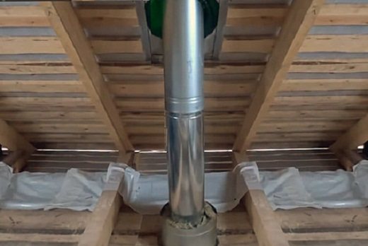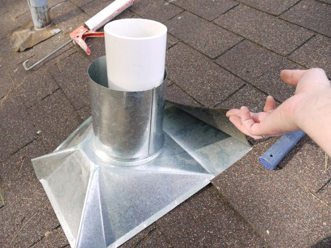 Заготовката трябва да се изнесе на покрива през тавана. Всички пролуки, особено кухините между покрива и разклонителната тръба, са запълнени с хидроизолация. Когато премахвате детайла, трябва да помните за безопасността.