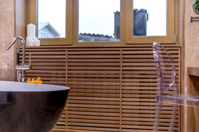 Тук самите тръби са скрити зад конструкция от гипсокартон, а за достъп до фугите, решетъчният екран е подвижен