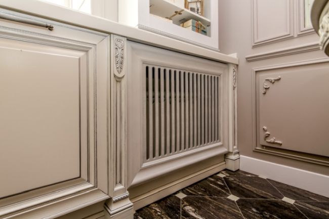 Това устройство е идеално за декориране. Той успешно крие обемни радиатори зад себе си и перфектно допълва интериора. Това обаче е неудобно от практическа гледна точка. Екранът предотвратява свободния достъп до батерията, влошава преноса на топлина и забавя циркулацията на топлите въздушни маси. Ето защо, ако решите да закупите нещо подобно, тогава най-добре е да отдадете предпочитание на перфорираните панели - няма да имате проблем с топлопроводимостта с тях.