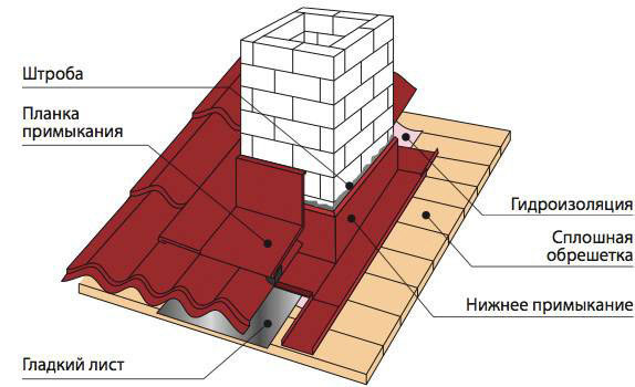 Вътрешните слоеве на покрива (пароизолация, топлоизолация, хидроизолация) в тръбния проход се изрязват и фиксират със скоби или пирони към напречните греди и гредите. Хидроизолационният слой е фиксиран около покривния проход с рамка. По този начин се осигурява надеждна изолация на комина от горимите елементи на покрива.