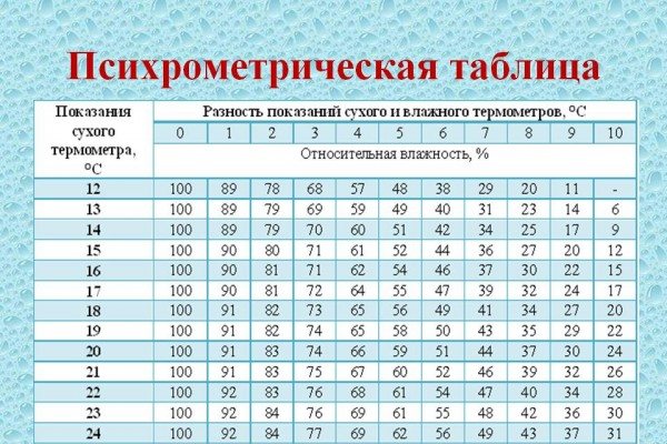 - Намерете получената разлика по стойностите на специална психометрична таблица на Assman, като определите нивото на влажност в помещението, от което се нуждаете.