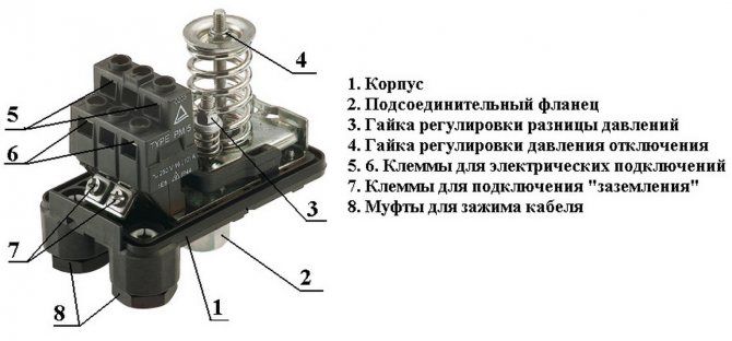 Първият е предназначен за взаимодействието на устройството с подаваната към него течност. Състои се от стъбло и две пружини. Поради последното се настройват оптималните параметри на налягането. Основната задача на последния е да свърже проводници към електричество. Това е метален терминален блок със затягащи винтове. В зависимост от положението на хидравликата, клемите се отварят и затварят.