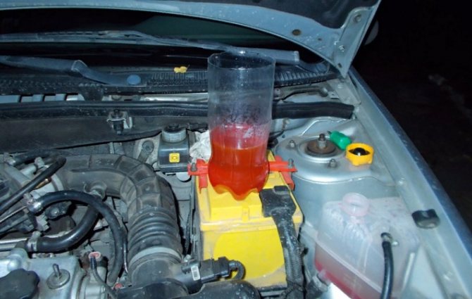 - Когато течността започне да изтича от отвора без въздушни мехурчета, отворът може да бъде затворен. След това в разширителния резервоар трябва да се добави необходимото количество охлаждаща течност.