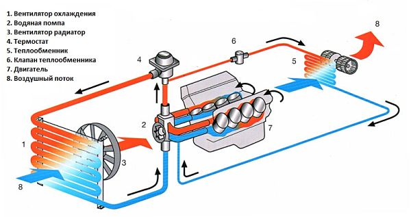 За по-добро разбиране, нека започнем с общите принципи на работа. Докато двигателят е студен, течността циркулира само през охладителната риза (специални канали в цилиндровия блок и главата на цилиндъра), без да навлиза в радиатора. Циркулацията се осигурява от водна помпа (помпа).
