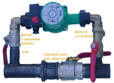 Тръбопроводите (монтажа) на помпата в отоплителната система се извършват, както следва. За да инсталирате помпата във вече работеща отоплителна система, трябва да се направи байпасна линия или така наречения байпас (байпас). За да направите това, изрежете основната (захранваща) тръба, където е поставен сферичният кран. Отделно байпасът се сглобява и монтира към основната тръба съгласно известна схема. Препоръчително е да инсталирате филтър пред помпата и сферични кранове от двете страни. Това е необходимо за аварийно изключване на помпата в случай на неизправност, без да се източва цялата вода от отоплителната система.