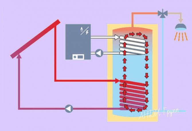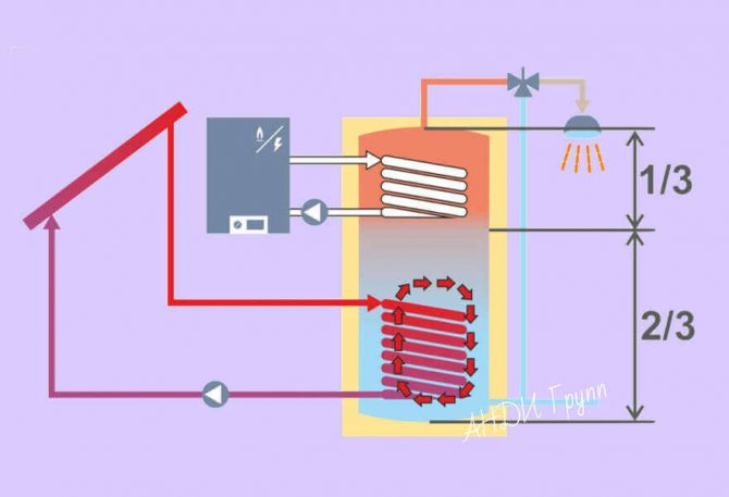 През него топлата вода навлиза в резервоара за съхранение. Охлаждайки се в процеса, той се спуска до мястото на кръговата помпа и с негова помощ се връща обратно в главния проход, за да се върне в котела за следващото отопление.
