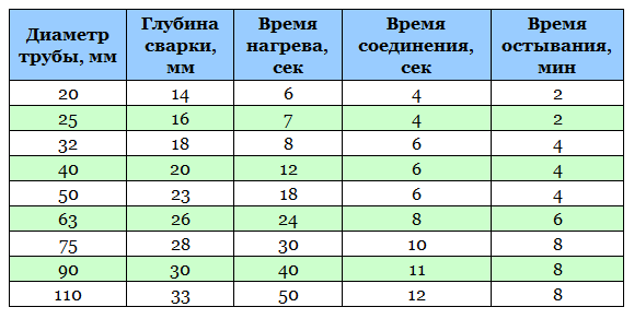 Друг важен момент е да не се преекспонира продукта в поялника. Има пряка връзка между диаметъра на тръбата и времето за нагряване. Таблицата по-долу показва данни за най-популярните диаметри.