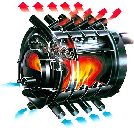 Изгарянето, твърдото гориво пренася максималното количество топла енергия към стените на конструкцията. Това води до нагряване на въздуха в тръбите, в резултат на което започва циркулацията му. Има два начина за регулиране на температурата - чрез намаляване на обема на зареждане с гориво или чрез намаляване на въздушния поток през пепелния съд.