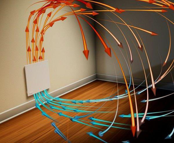 Нагретият въздух, в съответствие с физическия закон, се издига и се смесва с атмосферата на помещението, загрява го. Вентилаторът, монтиран в конвектора, подобрява циркулацията на въздушните маси и ускорява процеса на отопление.