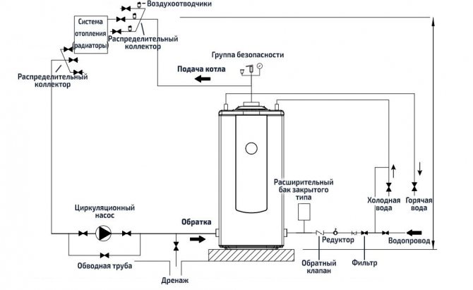 Тръбопроводите на котела също не се различават от използваните за инсталиране на аналози, пример за класическа схема на свързване към система от затворен тип е показан на снимката по-долу.