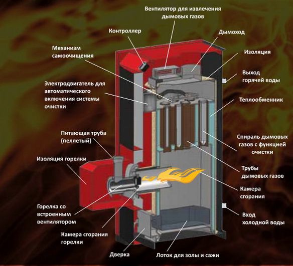 - Функция за самопочистване... Котлите за отопление на пелети имат спирала на димните газове. С течение на времето върху него може да се образува слой сажди, което значително ще намали мощността на оборудването;