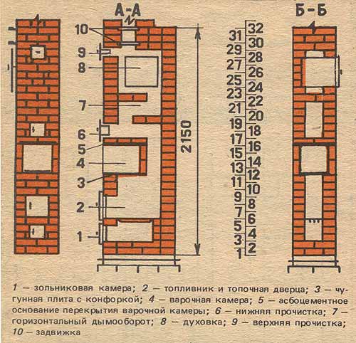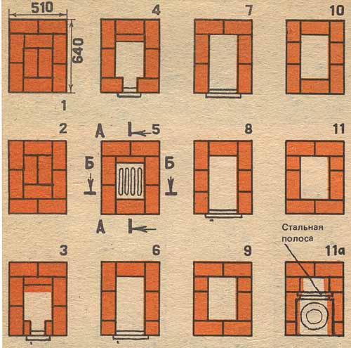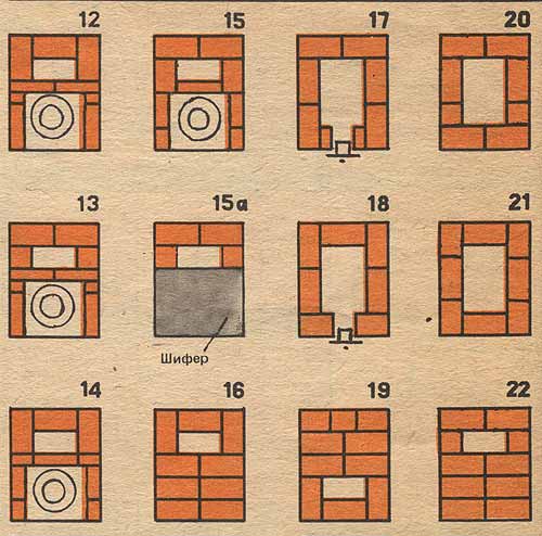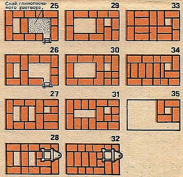 - На първия ред разтворът не се прилага. 12 парчета са разположени строго хоризонтално върху пясъка. Върху глинесто-пясъчния хоросан се поставя вентилатор. Вратата е обвита с азбестов картон, обвита с шнур. Закрепването се извършва с тел.