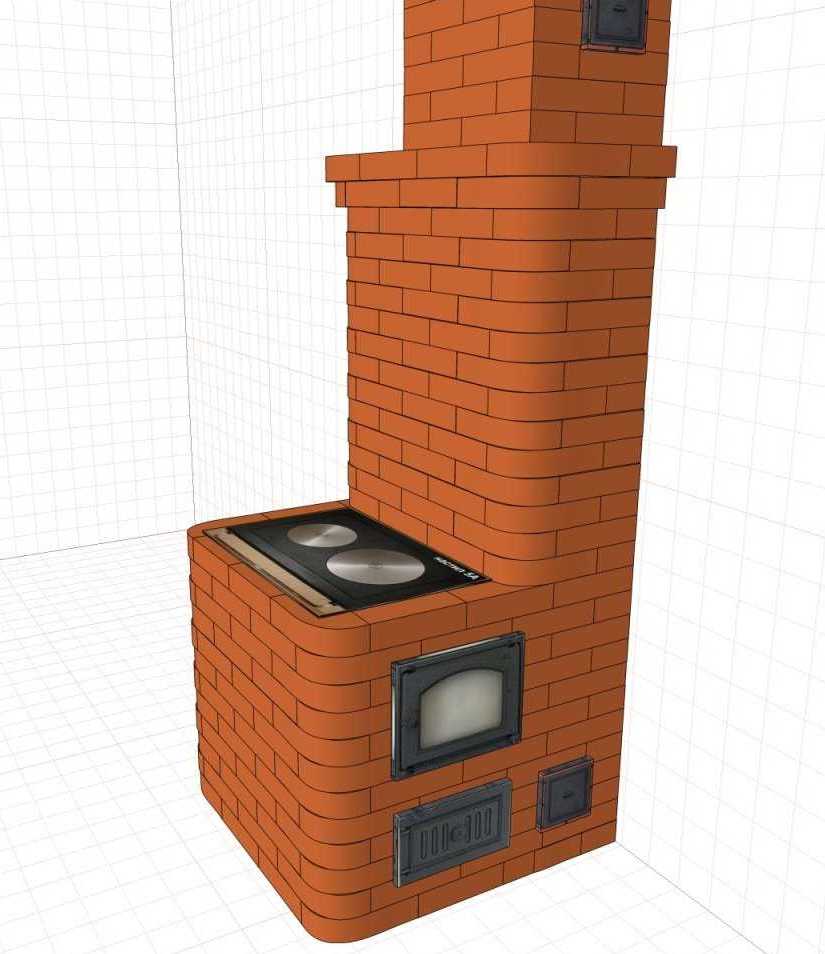 Идеална за малка къща, тази квадратна мини тухлена фурна е проста, компактна и ефективна. Дизайнът включва нисък комин с канална секция от 13 * 13 см. Печката има фурна, която ви позволява да готвите и да затопляте ястия. Шкафът е изработен от ламарина, но при желание може да бъде заменен с готова фурна с подходящи размери.