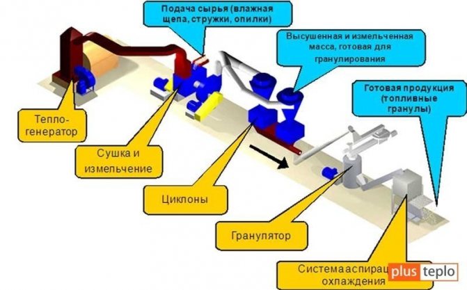 При производството на пелети за котела суровините трябва да преминат през определен технологичен процес на производствената линия. Основните етапи на този процес, използвайки примера за получаване на дървесни пелети, са както следва: