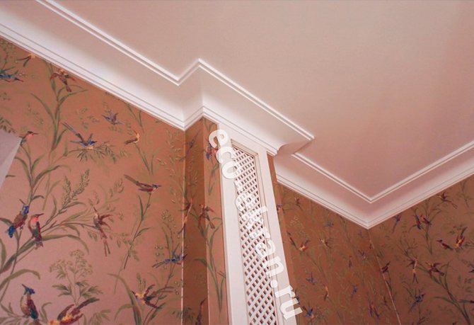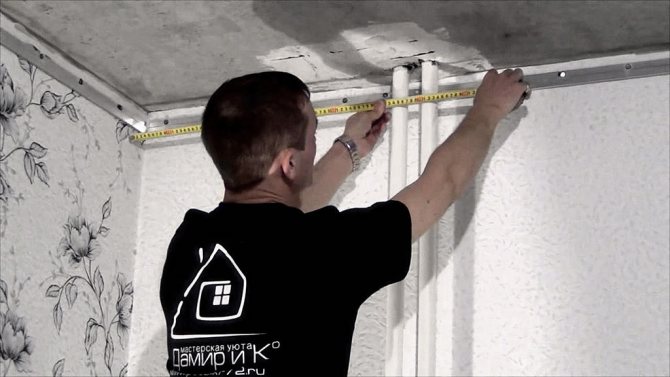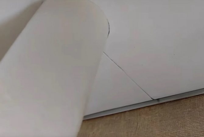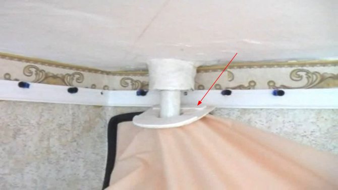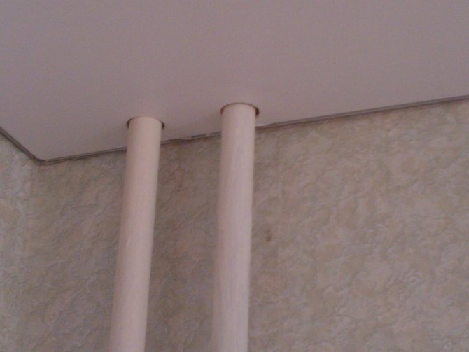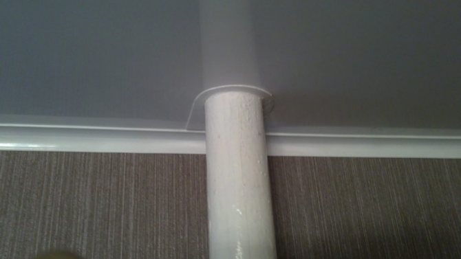 - Първо, трябва да изберете мястото, където ще бъде направен разрезът. Най-подходящата точка е на мястото, където тръбата преминава през тавана - на това място ще бъде възможно да притиснете материала добре към тръбата, така че да няма бръчки.