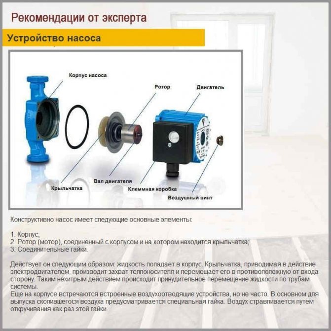 Помпата циркулира вода във веригата, благодарение на което повърхността се нагрява равномерно и предпазва къщата от топлинни загуби, което е особено важно за региони с изключително мразовита зима. Инсталирането на такова устройство е необходимо, но не във всички случаи. Смята се, че ако площта на пода е малка (до 40-50 м2), такова устройство не е необходимо да се монтира.