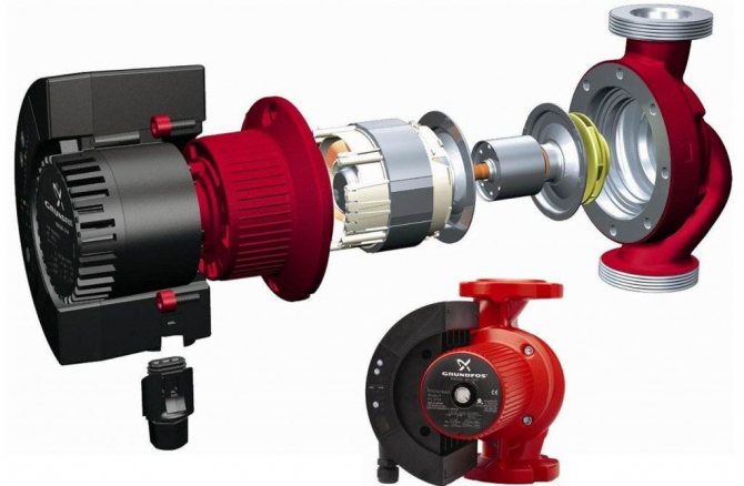 Почти всички модели помпи имат много сходен дизайн. Устройството за циркулационна помпа за отопление се състои от следните основни елементи: