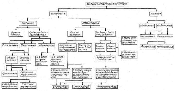 - според принципа на местоположението на климатика по отношение на пилотираната стая: централна (проектирана за няколко стаи и разположена извън оперираната стая) или локална (разположена директно в оперираната стая);