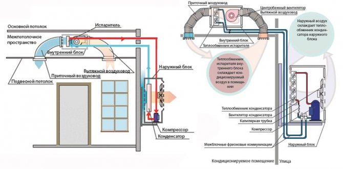 Сплит система - се състои от 2 блока, свързани помежду си с медни тръби, през които циркулира фреон. Шумни и повечето от тях са разположени извън стаята, а отвътре има стена, таван, канал или колона с добър дизайн.