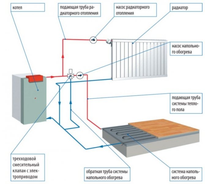 - тъй като клапаните са инсталирани както на захранването, така и на връщането, можете да изключите топъл под, без да спирате работата на цялата система. За регулиране на връщащата тръба е монтиран байпас, чрез регулиране на който можете да насочите част или цялата охлаждаща течност директно в котела.