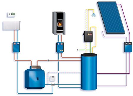 Най-новите разработени представители имат вградени нагревателни елементи за работа на съществуващи енергийни носители, а има и горелки, които ви позволяват да използвате както газ, така и дизелово гориво, просто като превключите превключвателя в желания режим. За да спестите пари и да получите желания ефект от отоплението на голяма площ, струва си да използвате топлинен акумулатор, най-важното в котлите, използващи въглища. Когато се използва твърдо гориво, мощността на котелната система не се регулира и помещението става изключително горещо. Настоящият топлинен акумулатор: