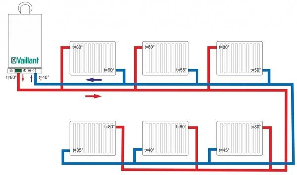 Несъмнено предимство на такава отоплителна система е малкият брой тръби в нея. И минус е температурната разлика между първото отоплително устройство от котела и последното. Този проблем може да бъде отстранен с помощта на циркулационна помпа, която ще стане много по-бърза да изхвърли цялата вода през системата и захранването с топлина и по този начин топлоносителят няма да има време да намали температурата.