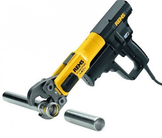 Освен това има пресови щипки за кримпване на металопластични тръбни валцуващи материали. под формата на прес пистолет, прилича на бормашина, с пистолетна ръкохватка. Устройството е лесно за използване.