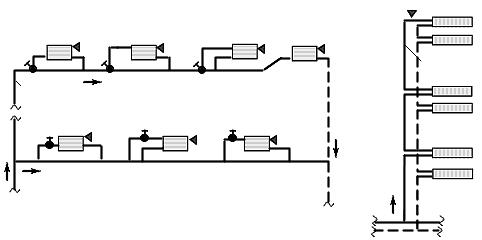В системи с принудителна циркулация за намаляване на потока на тръбите изходните и захранващите щрангове са разположени на нивото на първия.