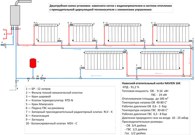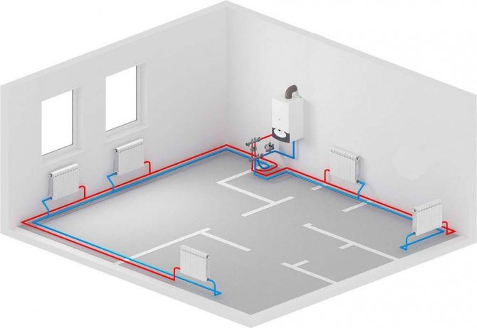 В такава система има два тръбопровода: през първия се подава и разделя горещ топлоносител, а през втория охладената течност се връща обратно в котела.