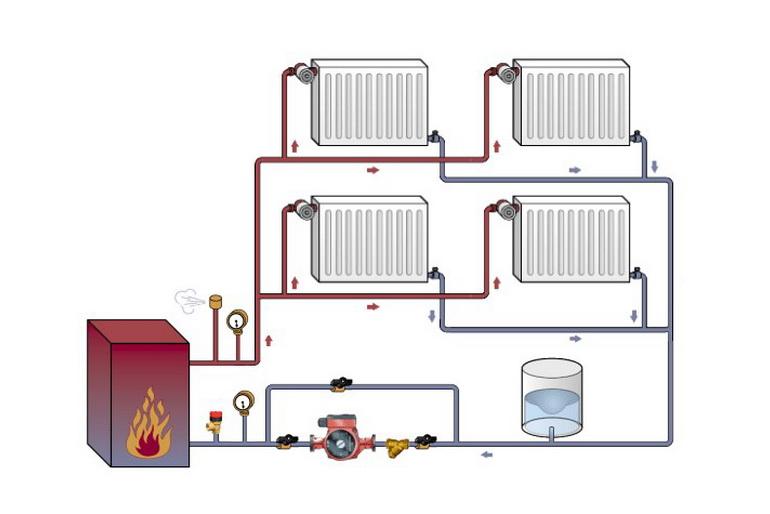 В тази система топлоносителят преминава през цикъла на нагревателя към радиаторите и обратно.