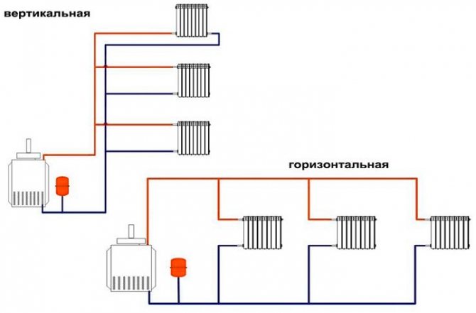 - Еднотръбна. Това е проста опция за полагане на линия за охлаждаща течност в частна и многоетажна сграда, както и в промишлено предприятие. Използва се в случаите, когато е необходимо да се прокара тръбопровод бързо и с минимални финансови инвестиции. Единствената забележка е ограничаването на дължината на тръбопровода около къщата до 30 м. Има три вида еднотръбна схема на свързване: хоризонтална, вертикална и "Ленинградка". Те се различават един от друг по начина на подаване и отвеждане на охлаждащата течност към батериите.