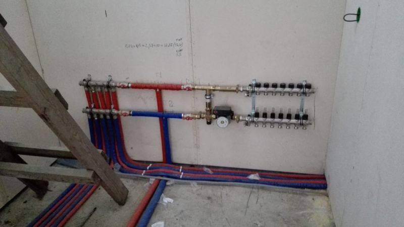 На пода, под стените, са монтирани два клона от тръби. Един клон е свързан към изхода за захранване на котела, а останалата част към изхода за приемане.