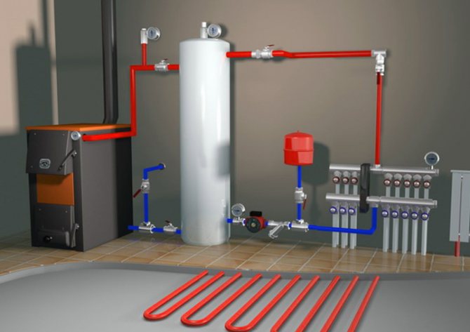 - Отоплителна инсталация. За прилагането на този CO са подходящи котли, работещи на твърдо гориво, газ (природен или втечнен) и електричество. Теоретично котлите с течно гориво също са подходящи, но възниква проблемът със съхранението на гориво в частна къща.