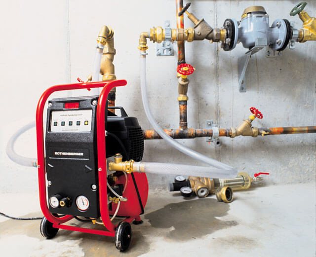 За промиване веригата се пълни с вода. Към него е свързан въздушен компресор. Това насърчава бързата циркулация на охлаждащата течност и причинява появата на турбулентни потоци. В резултат на това различни отлагания лесно се отделят от стените на тръбопроводите и батериите.