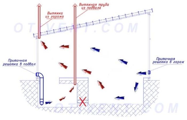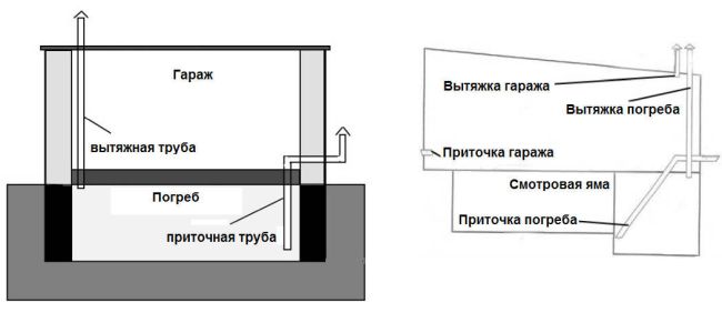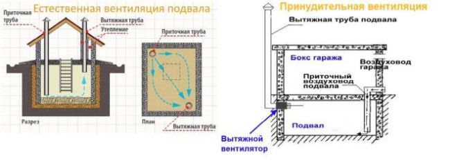 - тръбите за вентилация на мазето са монтирани в стените, ако мазето е разположено под гаража или под къщата, или през тавана, ако складът е разположен отвън;