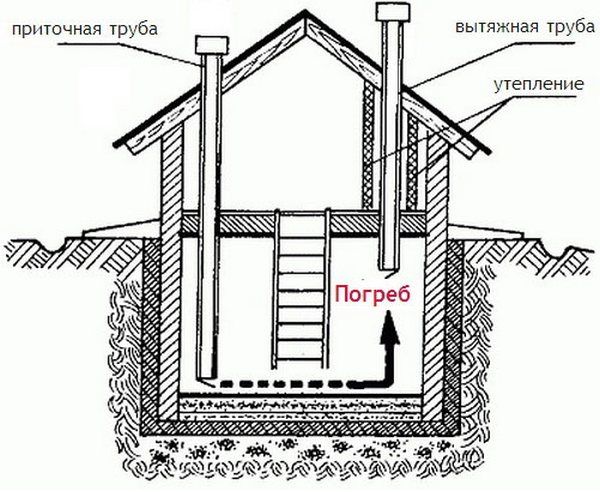 - вентилационното устройство в избата включва инсталиране на захранващи и изходящи щрангове на противоположни ъгли или стени. Необходимо е определено разстояние между тръбите. Това устройство осигурява максимално преминаване на чист въздух през стаята, изтласквайки застоялия въздух;