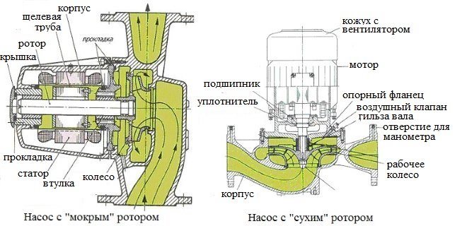 Всички циркулационни помпи, използвани за оборудване на отоплителни системи, са разделени в две широки категории: устройства с "мокър" и "сух" ротор. При помпите от първи тип всички роторни елементи са постоянно в охлаждащата среда, а в устройства с „сух“ ротор само част от такива елементи са в контакт с изпомпваната среда. Помпите с "сух" ротор се различават с по-голяма мощност и по-висока ефективност, но издават много шум по време на работа, което не може да се каже за устройства с "мокър" ротор, които издават минимално количество шум.