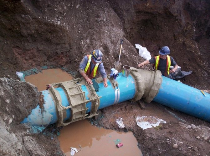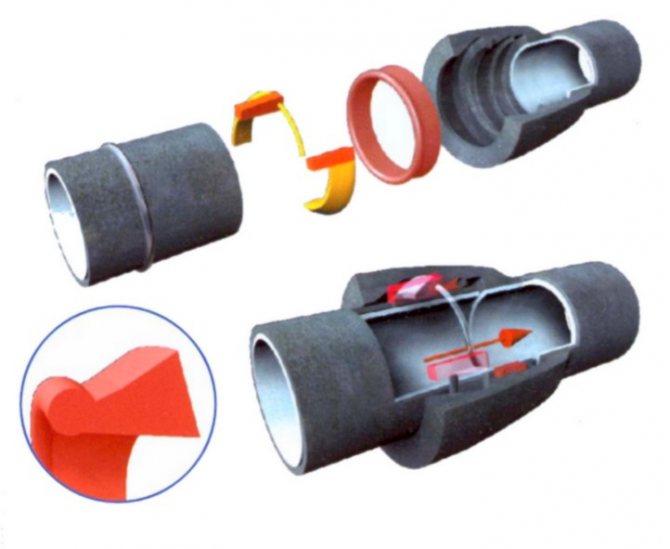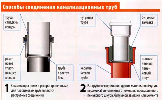 Справка! Съединенията на тръбите, изработени от чугун или бетон, се запечатват с помощта на бетоново-смолисти състави, съдържащи специален пълнител, а пластмасовите се запечатват с гумени уплътнения под формата на пръстени.