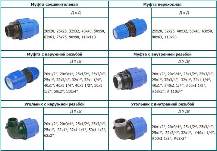 Отлята и заварена. Ако водоснабдителната система е предназначена за подаване на питейна вода, тогава за комбиниране на фугите се използва отлита муфа. За да могат пластмасовите тръби и адаптерът да имат запечатана връзка, е необходимо оборудване за заваряване. Този метод се прилага за тръби с диаметър по-голям от 50 mm.