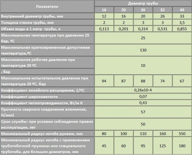 За да вземете окончателно решение, се препоръчва да се запознаете с техническите характеристики на металопластичните отоплителни тръби. За да направите това, трябва да проучите данните в таблицата.