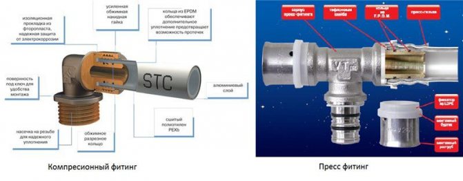 Кримпващи (компресионни) фитинги осигуряват разглобяема връзка, те могат да бъдат използвани повторно след демонтиране на стари тръби. И цената на такива части е много по-ниска от пресовите фитинги. От отрицателната страна може да се отбележи, че кримпващите елементи трябва постоянно да се затягат. За превенция това трябва да се прави 3-5 пъти годишно, ако фугите на тръбите изтичат по-често. Друг съществен недостатък е, че тръбите трябва да бъдат постоянно достъпни. Следователно няма да работи за монтирането им по скрит начин.