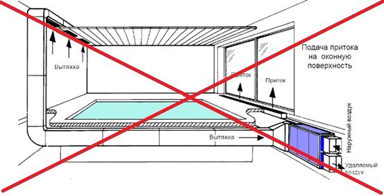 Съществуващите стандарти (SP 31-113-2004) ни казват, че обемът на изходящия въздух трябва да бъде по-голям от подавания въздух с не повече от половината от вентилирания обем на помещението (0,5 кратно)