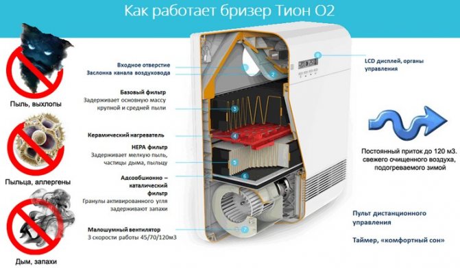 През зимата студеният въздух от вентилацията се загрява в инсталацията до необходимата температура и се подава в помещението от вентилатор, който може да работи в няколко режима с различна производителност. През лятото режимът на отопление се изключва автоматично, само функции за почистване. При по-скъпите инсталации се използва технология за рекуперация на топлина, когато вътрешният топъл въздух прехвърля енергията си към външното захранване, нагрявайки я. Ако в стаята е монтиран климатик, тогава подобен процес ще се проведе през лятото, само студеният ще бъде прехвърлен към захранващия въздух. Такава принудителна вентилация ви позволява да спестите до 60% от консумираната енергия за отопление или охлаждане.