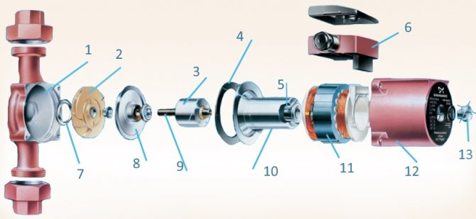 1. Подобрено тяло. Изработени от чугун. 2. Работно колело. Изработен от термоустойчив композитен материал (подсилен със стъклени влакна полиетерсулфон). Устойчив на корозия. 3. Ротор. По време на работа той е в изпомпваната течност. Затворена в тънкостенна феритна обвивка от неръждаема стомана, за да се намали намаляването на магнитния поток. Намалява вероятността от задръстване при въртене в роторната втулка. 4. Уплътнително уплътнение. Изработен от EPDM гума. Осигурява надеждно уплътнение на кръстовището на помпената част и корпуса на двигателя. При повторно сглобяване на помпата не е необходимо да сменяте уплътнението. 5. Лагери. Материал - керамика (алуминиев оксид). Осигуряват трайност и тиха работа благодарение на висока твърдост и нисък коефициент на линейно разширение на керамиката. 6. Кутия за лепило. За закрепване на проводниците в кутията за лепило се използват удобни пружинни скоби, които улесняват електрическата инсталация. Кабелната втулка е снабдена с уплътнение и устройство за облекчаване на деформациите.Удобно превключване на скоростта благодарение на специалната конструкция на превключвателя, дори ако помпата е инсталирана на труднодостъпно място. 7. Уплътнение на гърлото. Намалява хлабината между корпуса и работното колело, което намалява течовете.Изработена от неръждаема стомана, която елиминира корозията на уплътненията. 8. Лагерна плоча. Изработен от неръждаема стомана. Твърдата конструкция на плочата удължава живота на лагерите. Осигурява подравняването на ротора и корпуса. 9. Вал. Изработен от керамика (алуминиев оксид). Конструкцията на кухия вал подпомага бързото отвеждане на въздуха от помпата по време на пускане и ефективно охлаждане на ротора. Пръстеновидните жлебове в точките на свързване на вала и лагера изключват образуването на скала в лагерните възли. Възвратен клапан (гумена топка) вътре в шахтата предотвратява изтичането на струя течност под високо налягане при отвиване на винтовата тапа. 10. Втулка на ротора. Материал - феритна неръждаема стомана. Гладката повърхност минимизира загубите от триене. Изработен чрез дълбоко изтегляне, той осигурява перфектна плътност и здравина поради липсата на заварени шевове. Минимално намаляване на магнитния поток между ротора и статора поради ниската дебелина на стената на облицовката и специалния материал. Тънките стени на роторната втулка допринасят за ефективното охлаждане на електродвигателя. 11. Статор. Намотките на двигателя са устойчиви на блокиращ ток, така че не се изисква допълнителна защита на двигателя. 12. Корпус на двигателя. За по-лесен монтаж е възможно корпусът да се монтира с лепяща кутия в една от четирите позиции. За поддръжка двигателят може да бъде свален, без да се изважда помпата от системата. 13. Винтова тапа. Развива се при стартиране за отстраняване на въздуха от помпата.